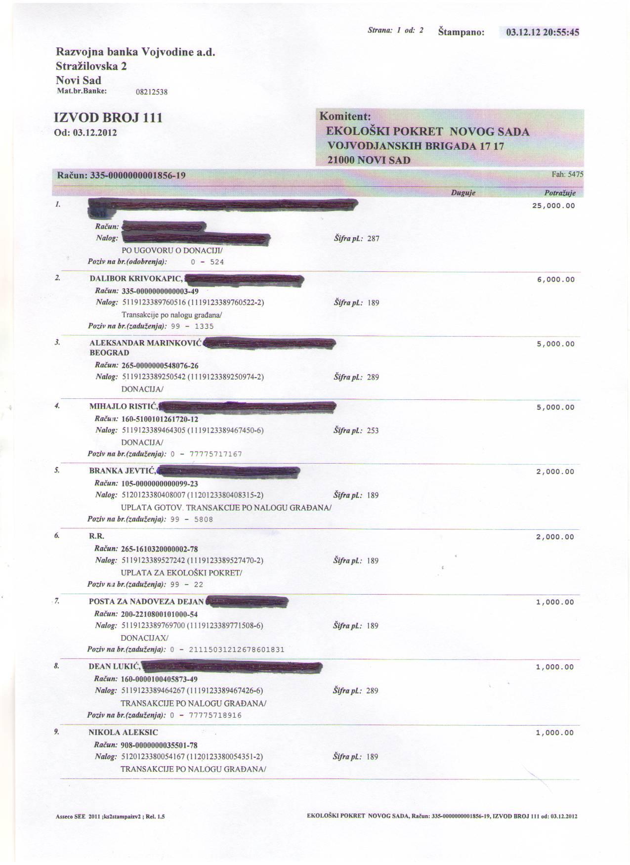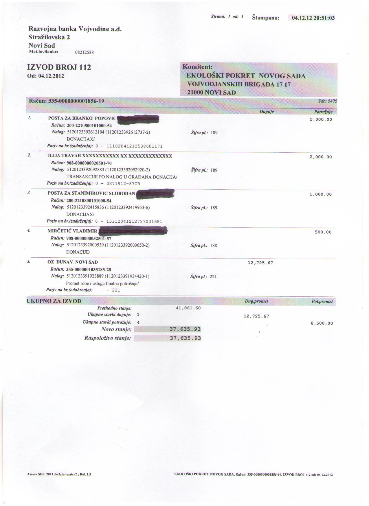 Најискреније се у име Еколошког покрета захваљујем свим групама и организацијама које су пренеле апел Еколошког покрета, а посебно добротворима: Александру Вујанову, Зорану Грозданићу, Бранки Јевтић, Далибору Кривокапићу, Дејану Лукићу, Александру Маринковићу, Дејану Надовези, Михајлу Ристићу, Борису Зечевићу, Јасмини Илић, Јадранки из Републике Српске и анонимном добротвору, који је уместо свога имена уписао моје име да би избегао захвалност, који су нам несебично помогли својим донацијама. Лично дугујем велику захвалност Вероники Томић из Крагујевца на лепим и топлим речима подршке којима је обавестила јавност о блокади рада Еколошког покрета.